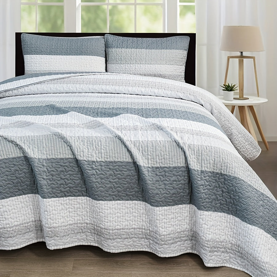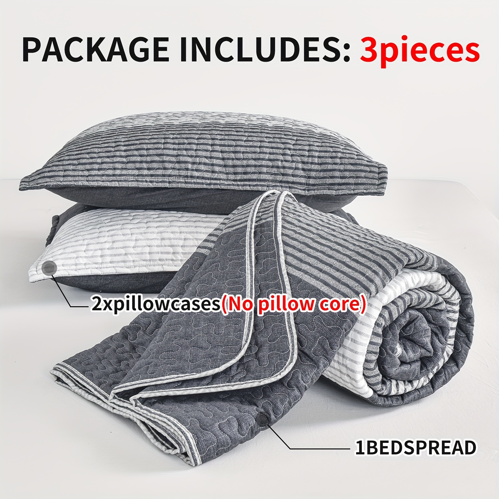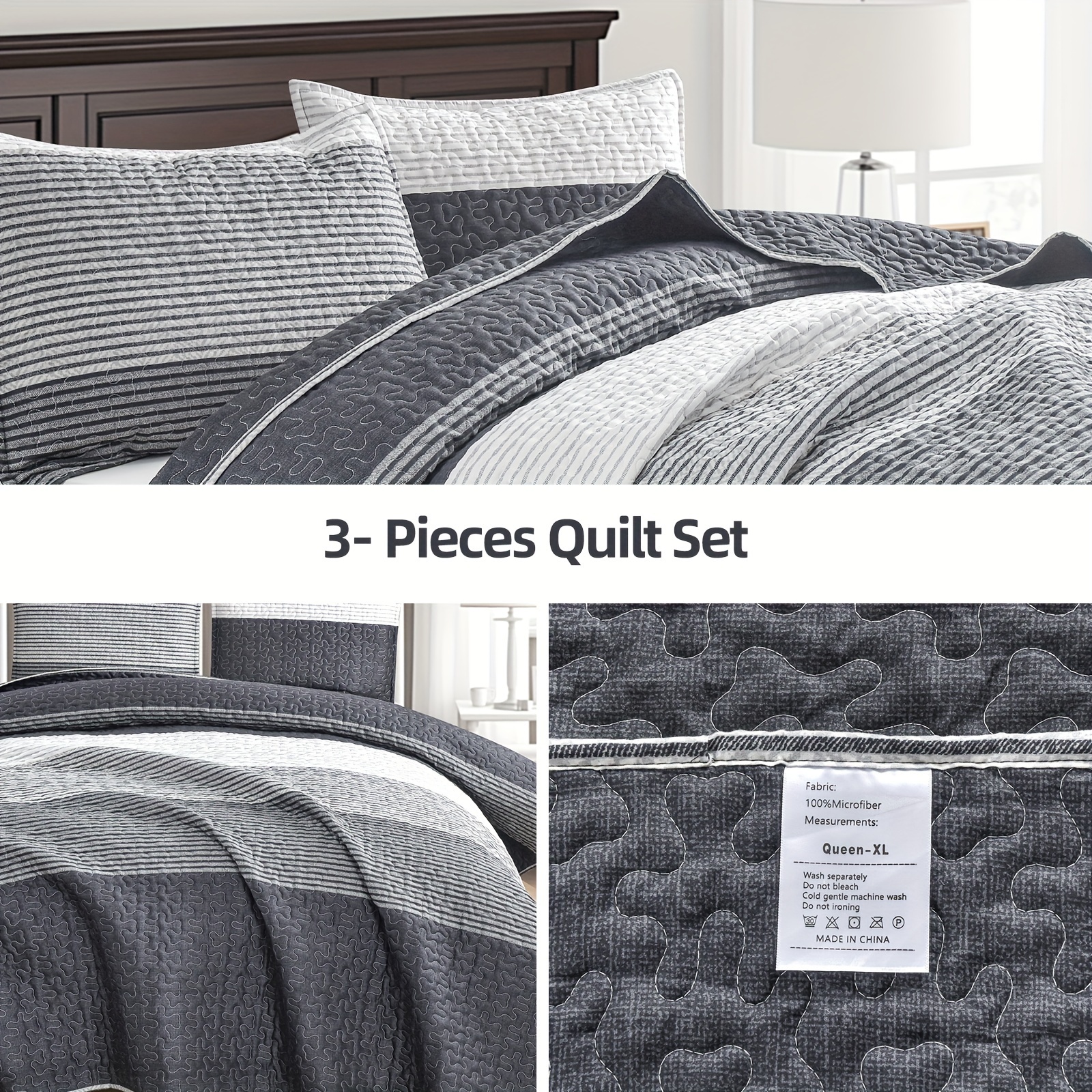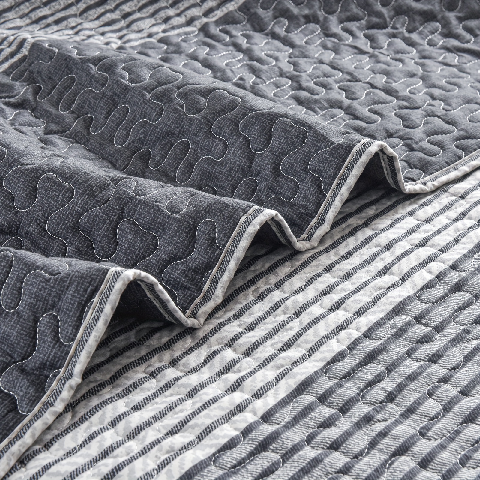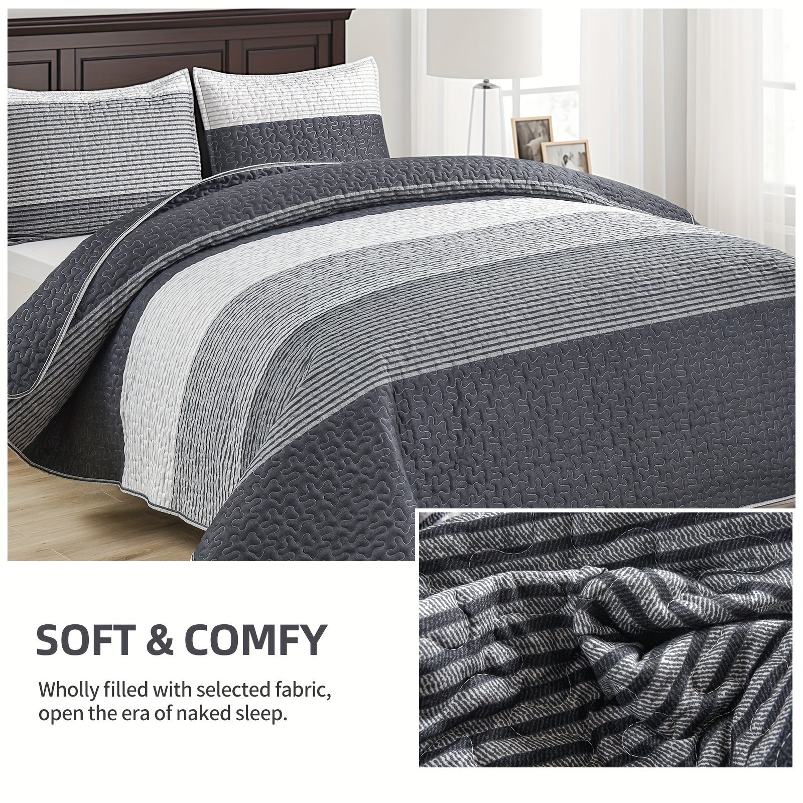 Product Description: Transform your space with this cozy quilted bedspread set, blending dark grey tones with striped patchwork for modern...