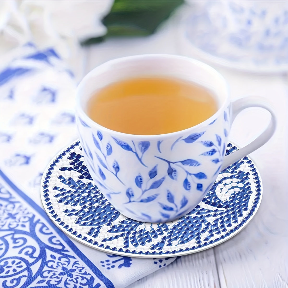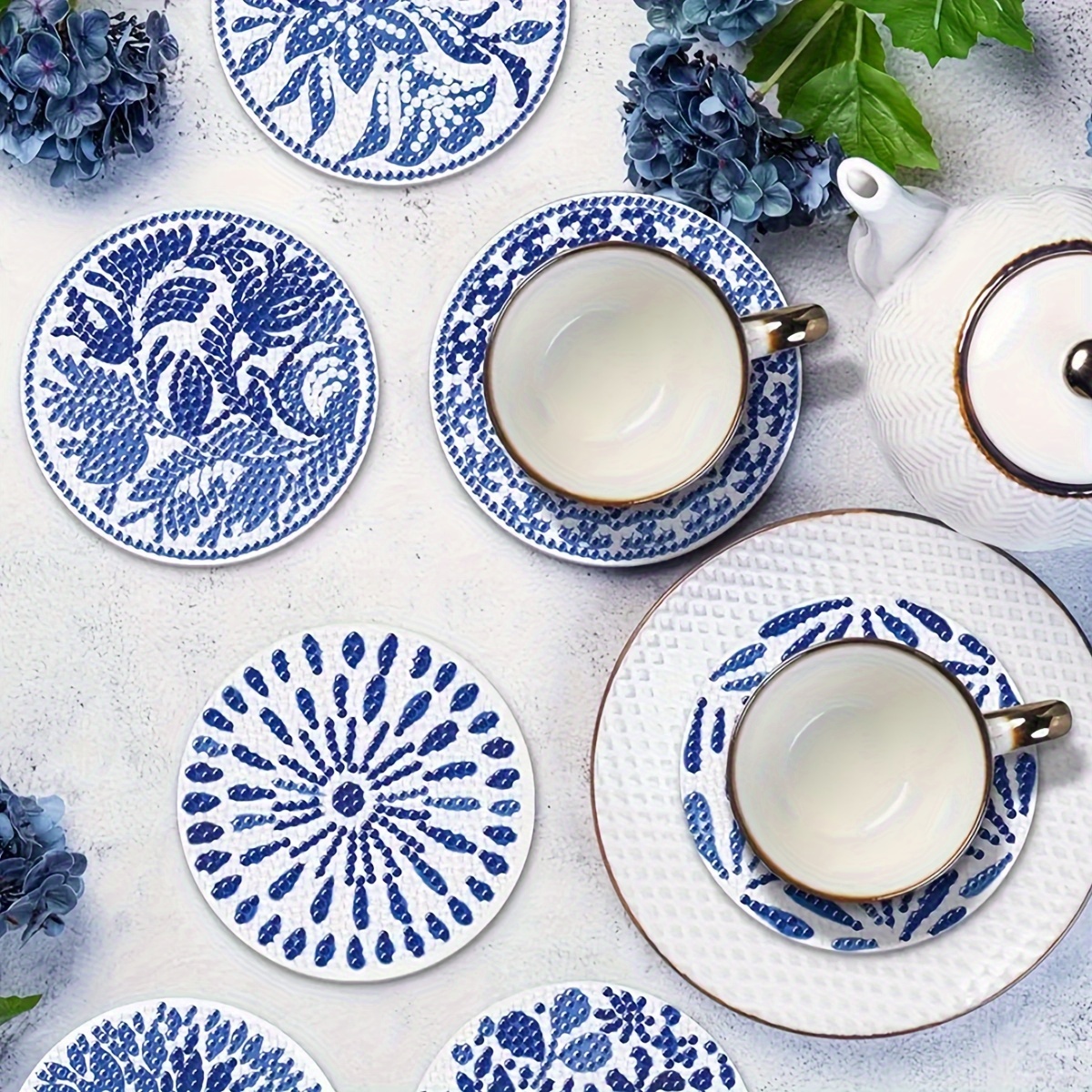 Transform your space with these stunning blue and white pattern diamond-painted coasters. Perfect for DIY lovers, they add sparkle and style to your home décor.